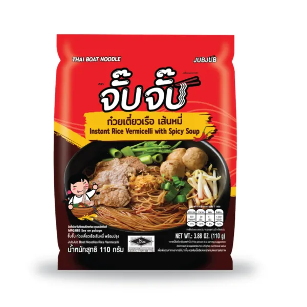 Indulge in the delicious and convenient JubJub Instant Rice Vermicelli with Spicy Soup. Each pack contains 110g of flavorful rice vermicelli noodles paired with a spicy and aromatic soup base. With 6 packs/bundles included, you can enjoy a quick and satisfying meal anytime, anywhere. Simply add hot water and in minutes you'll have a piping hot bowl of savory and spicy noodles. Perfect for busy days or when you're craving a comforting and spicy treat. Experience the bold flavors of JubJub Instant Rice Vermicelli with Spicy Soup today! Ingredient: Vermicelli rice noodles (55g), Boat Noodles paste (50g) fried Garlic(5g) Pack Dimension: 15x19x6 cm Gross weight: 4 kg/CTN FCL: 1,400 CTN