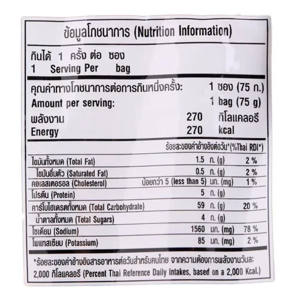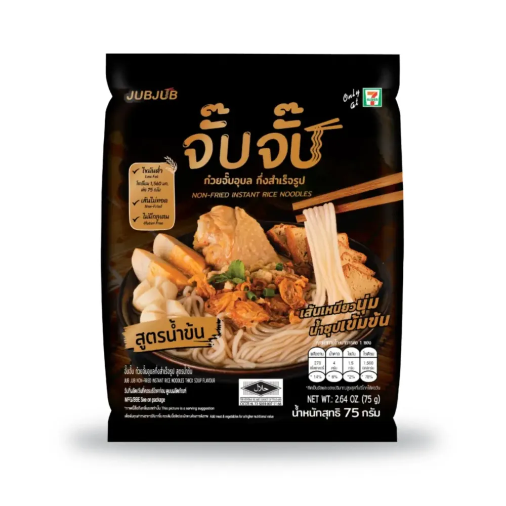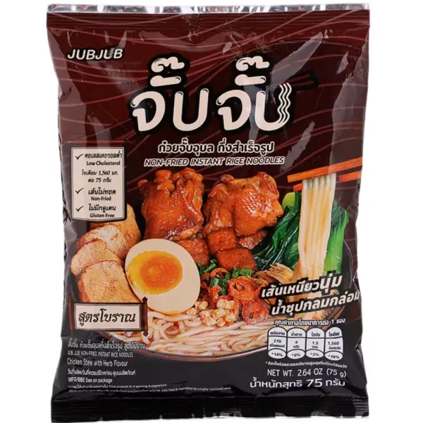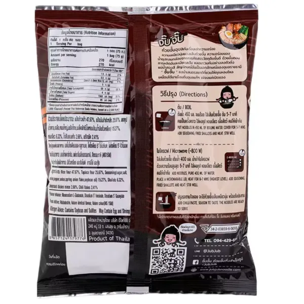 Indulge in the delicious and wholesome JubJub Non-Fried Chewing Thick Rice Ramen Noodle Soup. Each pack contains 75g of hearty, chewy noodles made from thick rice, providing a satisfying and filling meal. This bundle includes 6 packs, perfect for stocking up your pantry with a convenient and tasty option for lunch or dinner. Enjoy the rich flavors of the soup broth and the satisfying texture of the noodles without the guilt of fried ingredients. Upgrade your noodle soup experience with JubJub Non-Fried Chewing Thick Rice Ramen Noodle Soup! Ingredient: Rice Noodle (57g), Soup Seasoning (11g), fried shallots(4g) , fried chili (3g) Pack size: 15x19x6 cm Gross weight: 2 kg/CTN FCL: 1,400 CTN / 1x20 Ft Retail Price (Thailand)